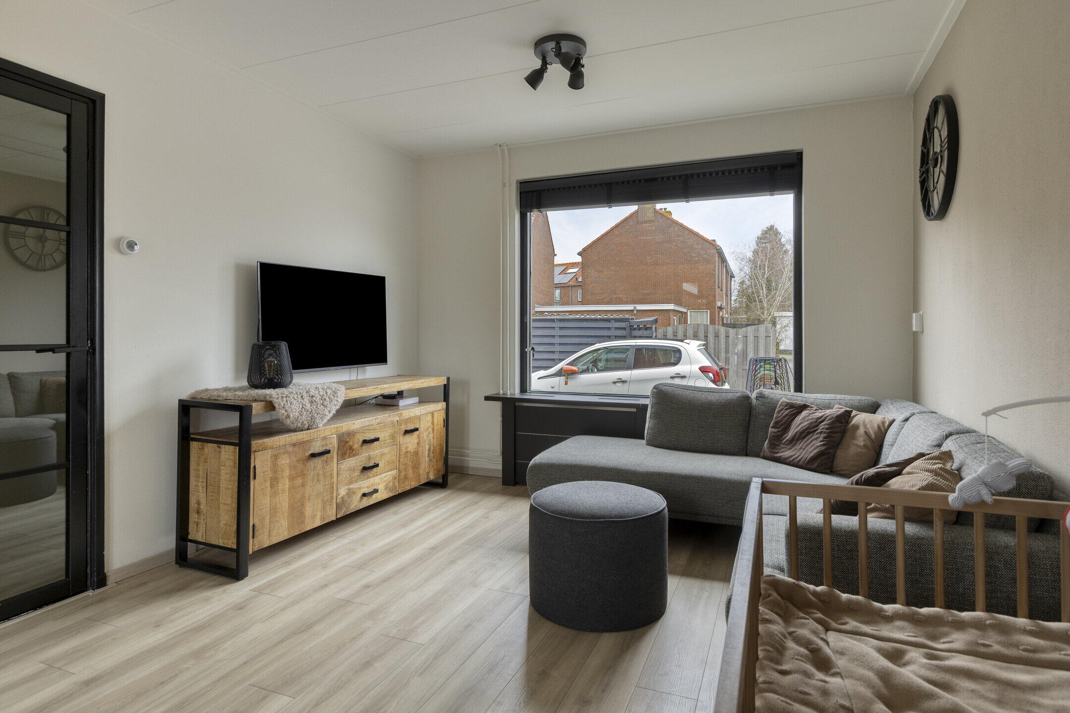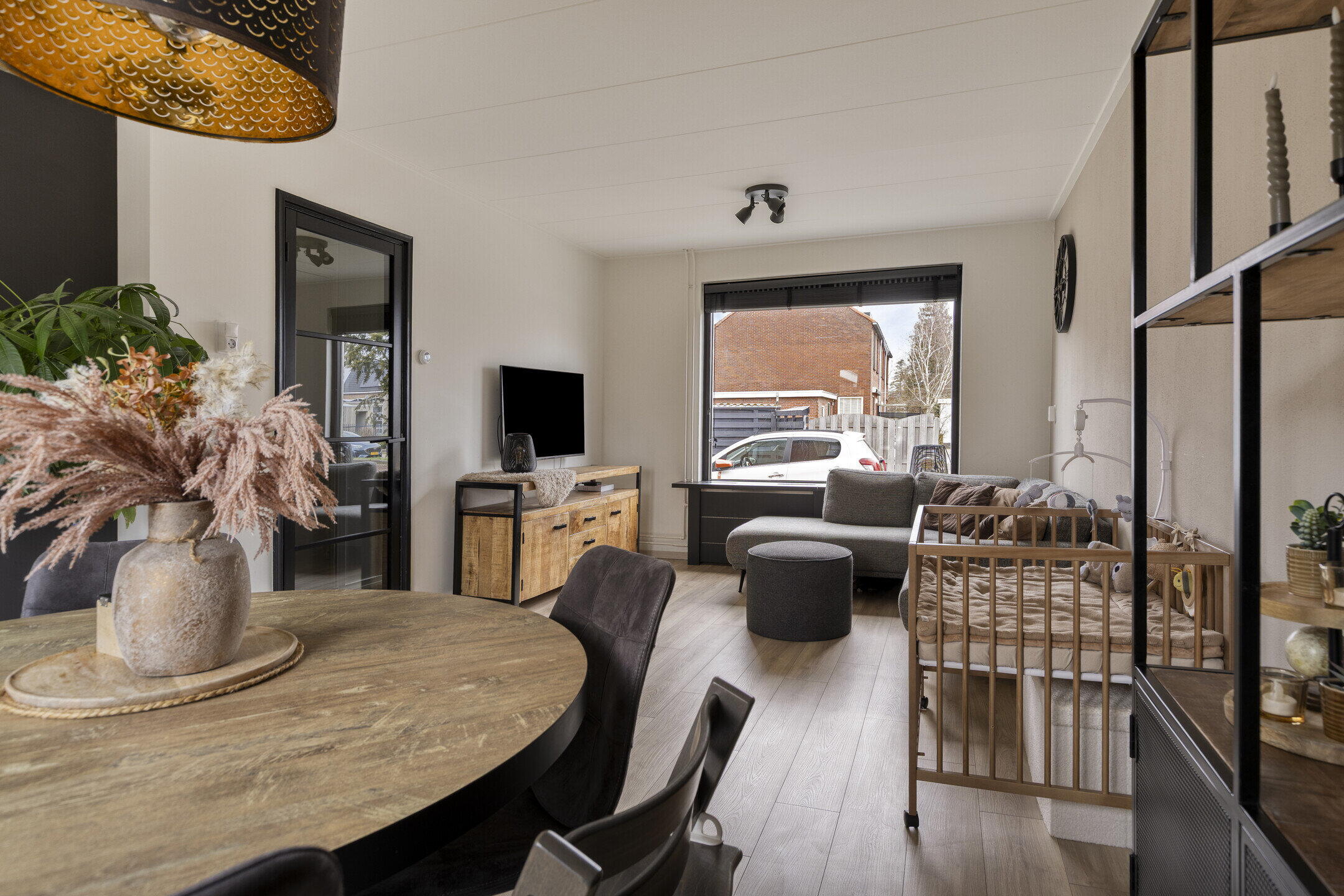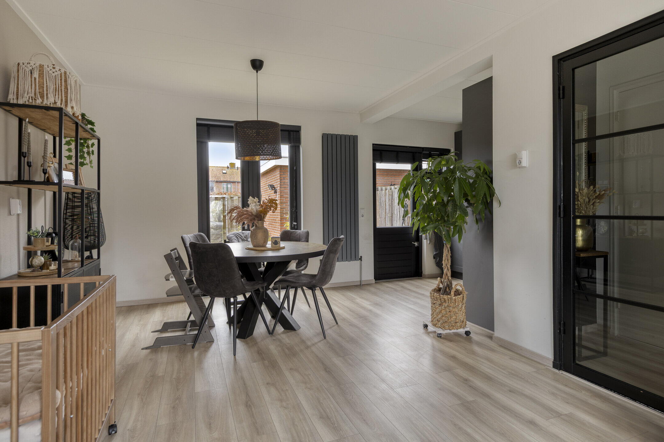 Bij binnenkomst in de woning wordt u verwelkomd in de entree, vanwaar u toegang krijgt tot de meterkast, het moderne toilet en de trapopgang naar de eerste verdieping. De lichte woonkamer is een waar hoogtepunt van deze woning. Door de openslaande deuren kunt u de achtertuin eenvoudig betrekken bij uw woonruimte, wat zorgt voor een uitnodigende en open sfeer. De royale ramen zorgen voor een overvloed aan natuurlijk licht, waardoor de woonkamer een warm en uitnodigend karakter heeft.