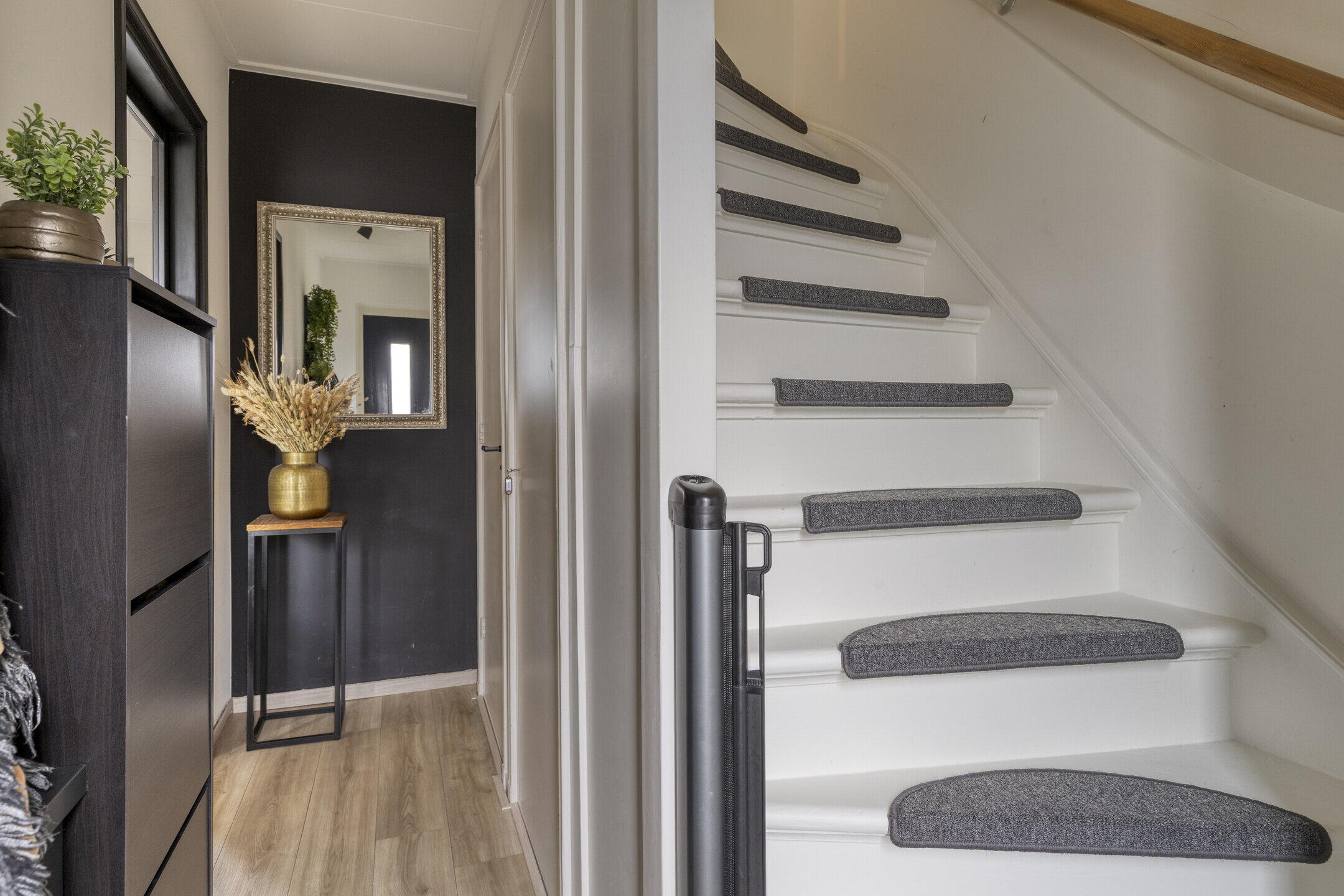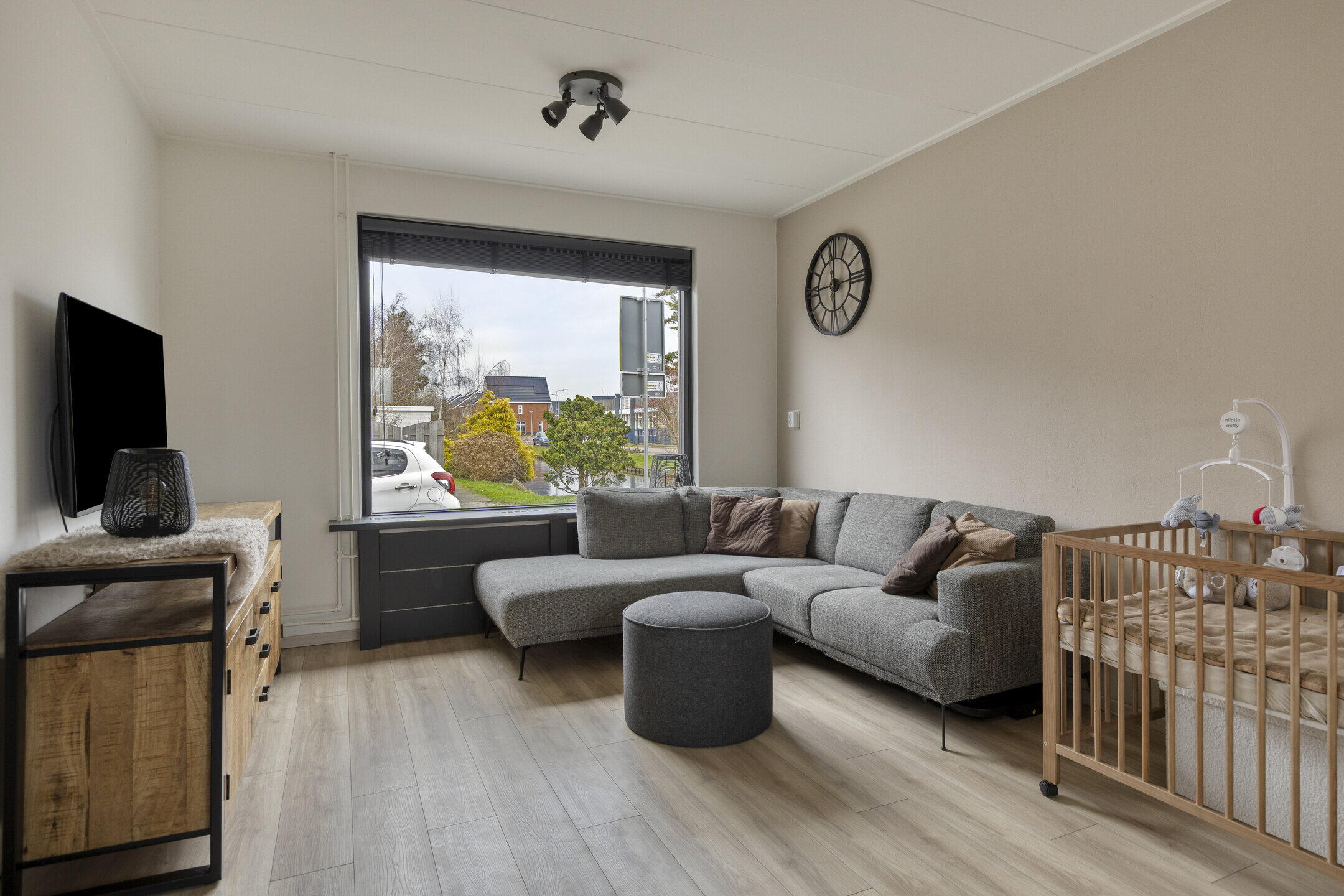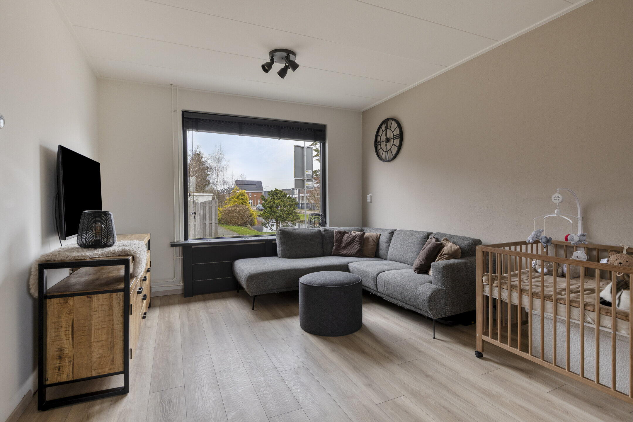 Bij binnenkomst in de woning wordt u verwelkomd in de entree, vanwaar u toegang krijgt tot de meterkast, het moderne toilet en de trapopgang naar de eerste verdieping. De lichte woonkamer is een waar hoogtepunt van deze woning. Door de openslaande deuren kunt u de achtertuin eenvoudig betrekken bij uw woonruimte, wat zorgt voor een uitnodigende en open sfeer. De royale ramen zorgen voor een overvloed aan natuurlijk licht, waardoor de woonkamer een warm en uitnodigend karakter heeft.